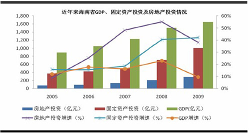 2009年,海南省全省105個重點建設項目完成投資486億元,比上年增長33.6%。電網跨海聯網一期、華能東方電廠一期、海口港二期、叉河一期100萬噸水泥、國投三期200萬噸水泥、海宇20萬噸鍍錫薄板等已經竣工投產或運營;東環鐵路、大廣壩二期、洋山地區土地整理與生態恢復、GSP網絡建設、東方四更風電一期、神州半島開發區、石梅灣旅游開發區、香水灣、清水灣、土福灣、永慶旅游區、三亞灣新城、馬村港擴建一期等一批重點項目投資進展較快,完成進度達到90%以上;航天發射場、80萬噸甲醇、海口至屯昌高速公路、海口國際會展中心、中海油精細化工等陸續開工建設。2009年海南省全年全社會固定資產投資總額達到1,002.50億元,比上年增長41.98%,全年房地產開發投資287.90億元,增長52.08%。