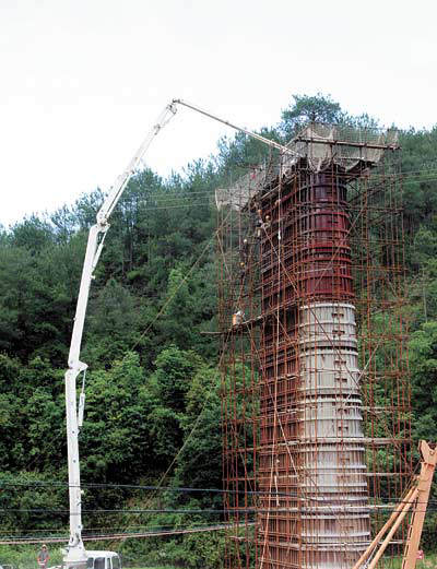 總長447米的贛龍鐵路復(fù)線朋口八線亭大橋是該項(xiàng)目最早動工的橋梁,該大橋共有13座橋墩,昨天,施工人員正在澆注首座橋墩的混凝土,這座高27米的橋墩目前已完成20米高度,有望下月初建成,將成為贛龍復(fù)線全線矗立的第一墩。