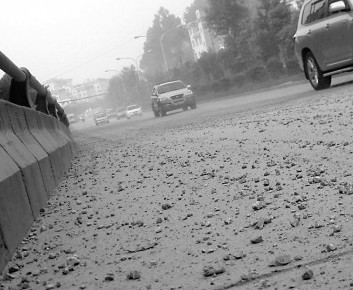 在靠近云南師范大學龍泉校區的路段上,記者看到過往車輛均緊閉著窗戶行駛在“迷霧”中,車輪下還發出“嚓嚓”聲,卷起陣陣灰塵;行人則捂緊鼻子,瞇著眼睛,快速走路。而公路上一層泥沙碎石順著龍泉路延伸了約有兩公里。