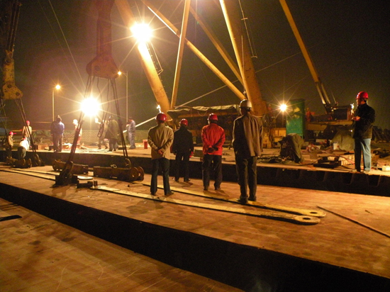 為此,設計、建設、施工、監理單位通力合作,精心組織、科學施工,在設計中采用提高混凝土中鋼筋的保護層厚度、采用高性能混凝土、墩柱設置鐵鋼砂混凝土防護層等措施提高橋梁耐久性。施工中創新式的采用“滾裝接力,滑移接力”的卸船新工藝及“由水域變陸地,把陸地當水域,平拉正吊”的吊裝方法。解決了鋼箱梁吊裝的難題。為大橋的施工提供了安全質量技術保證。