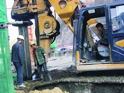 3時08分,商砼車來到峰迭新區,進入了省建投六公司的工地內。就在袁師傅駕著車慢慢靠近井樁孔時,現場施工人員突然示意他停車,袁師傅下車詢問情況。“剛剛挖好的井孔塌了。”施工員南鑫說,要重新挖井孔。隨即,他便指揮著旋挖機開始挖井樁。當挖到10米深時,突然旋挖機停了下來,駕駛員說地下有石頭,需要將石頭破碎。旋挖機換上直徑約一米大的鉆頭,又開始施工,這時已經是4時30分。