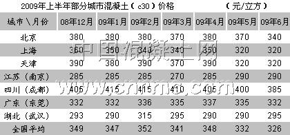 2009年上半年,1~3月份,是傳統(tǒng)銷售淡季,但混凝土價格卻依然平穩(wěn),2月份較去年12月份相比還有上漲趨勢;4~5月份,開始進入旺季,4月份混凝土價格穩(wěn)中略有小幅上揚;進入6月,由于農(nóng)忙、雨季、高考、中考和高溫等外在因素影響工程進度,混凝土需求量出現(xiàn)下降,使混凝土價格下滑到了上半年最低價。
