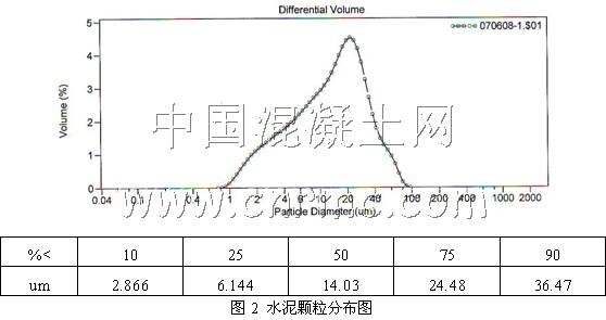寧國P.I52.5水泥經激光粒度儀測試,顆粒分布曲線如圖2