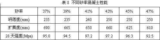 同時我們在其他材料不變的條件下,對不同的砂率進行混凝土對比試驗,結果如表8。