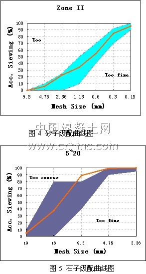 從圖5的級配曲線中可發現,盡管總體選用的石子較好,但9.5檔的篩余還是偏多,不盡理想。