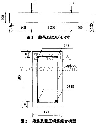 矩形截面鋼筋混凝土簡支梁,配有受拉主筋、受壓鋼筋、箍筋,載荷以及截面尺寸如圖1和圖2所示,利用ANSYS分析此梁受力情況⋯ 。