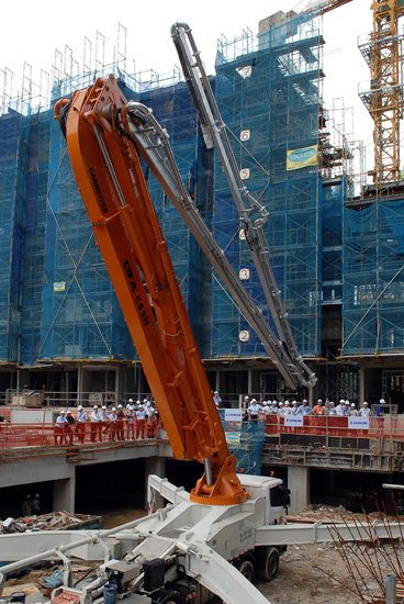 論壇期間,主辦方在新加坡工地現場向來賓展示了CIFA品牌62米6節臂碳纖維泵車,現場泵送。新技術新材料的應用,大大提高了設備的靈活性、便利性、安全性和施工效率,得到了與會嘉賓的高度認可。