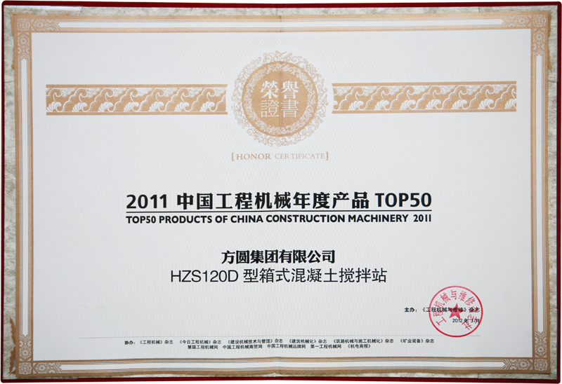 2012年3月27日由《工程機械與維修》主辦,《工程機械》、《今日工程機械》、中國工程機械商貿網等多家媒體共同協辦的“2011中國工程機械年度產品TOP50”頒獎典禮在北京北辰洲際酒店盛大舉行。來自發改委、工信部、商務部、中國機械工業聯合會、中國工程機械工業協會及下屬分支機構、相關行業協會,以及工程機械制造企業、施工企業、科研院所、高校、新聞媒體的200余位嘉賓參加了此次年度盛會。此次頒獎典禮以“2012 工程機械行業的變奏時代”為主題,關鍵詞圍繞“疑問”、“信心”、“理性”、“成熟”展開,在2012年工程機械行業形勢撲朔迷離的狀態下,讓各家工程機械龍頭們就當下熱門議題發表看法。方圓集團榮獲工程機械行業“2011年度產品TOP50”獎,方圓HZS120D箱式混凝土攪拌站榮登榜單。