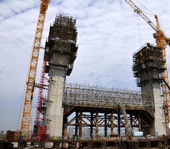 武漢鸚鵡洲長江大橋三號塔下橫梁為兩端固結的預應力鋼筋混凝土梁,共分為2次澆筑,第一次澆筑4米,第二次澆筑3米。此次混凝土澆筑共567方混凝土。武漢鸚鵡洲長江大橋建成后將成為世界上跨度最大的三塔四跨懸索橋。