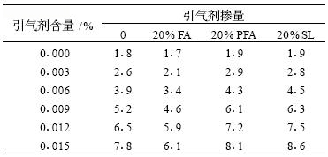 4.5% )。通常情況下,混凝土引氣劑摻量為膠凝材料用量的0.01% ~0.015%,而聚羧酸類混凝土引氣劑在該摻量下的引氣量達到6.1% ~8.6%,可滿足特殊使用要求(見表2)。