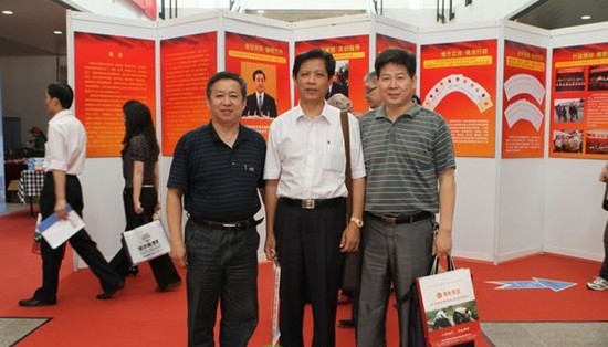 在展會上,湖北省散辦調研員彭漢橋與海南省散辦主任謝喜、安徽省散辦副主任黃先植合影留念