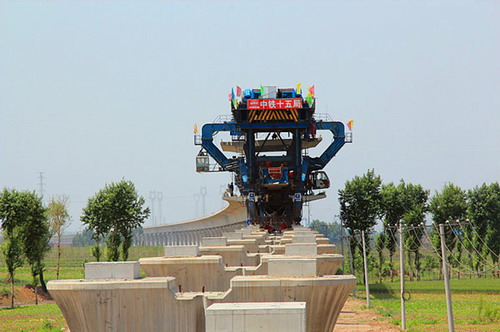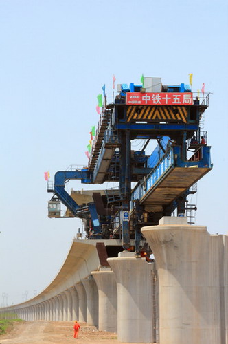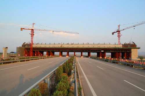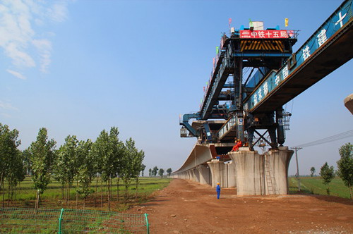 大西客專平遙(跨汾平高速)特大橋全長13200米,貫穿平遙、介休2個縣\市,3個鄉鎮,12個行政村,共439跨,需施工樁基3778根、承臺墩身各440個,是整個大西客專的重點工程,其中跨汾平高速系桿拱是全線的控制性工程,建設要求標準高、施工難度大。該橋由中國鐵建中鐵十五局集團承建,其下部工程由中鐵十五局集團五公司負責施工,制梁任務由中鐵十五局路橋公司承擔,架梁任務由中鐵十五局六公司負責。