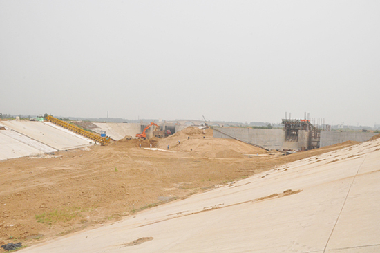 正在施工中的七里河倒虹吸進口漸變段與連接區、排冰閘邊坡
