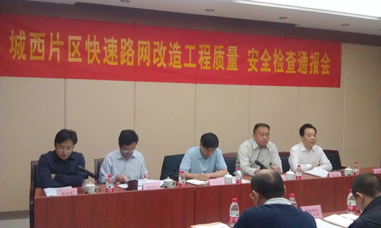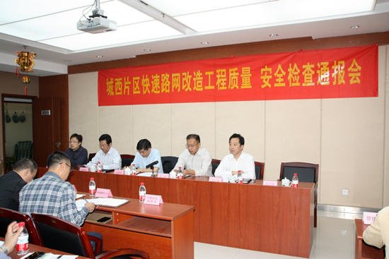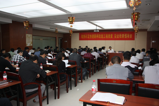 為保障城西片區(qū)快速路網(wǎng)改造工程施工進度,提高實體工程質(zhì)量,強化各單位責任意識,通報檢查情況,市城西片區(qū)快速路網(wǎng)改造工程指揮部于2012年10月13日上午召開了質(zhì)量安全檢查通報會。市住建委朱家祥副主任、市政質(zhì)監(jiān)站郭蘇杰處長、市城建集團鄒銳副總經(jīng)理、南京市預拌混凝土管理處萬仁瑜處長出席會議。另外,向城西干道供應混凝土的6家混凝土公司負責人參加會議。