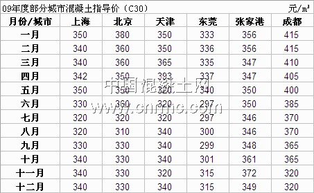 09年北京市混凝土平均價格走勢比較平穩。北京市混凝土協會在09年上半年對C30混凝土指導價定為350、360元/ m3,其它等級差別在15~20之間。根據市場情況來看,由于大多數建筑工程尚未完全啟動,原材料價格上漲,所以價格有點偏高,到09年下半年北京市混凝土協會對C30混凝土指導價定為320、330元/ m3,和去年的價格相比沒有太大變化。09年北京市C30混凝土價格走勢圖如圖一。