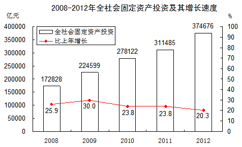 全年全社會固定資產投資374676億元,比上年增長20.3%,扣除價格因素,實際增長19.0%。其中,固定資產投資(不含農戶)364835億元,增長20.6%;農戶投資9841億元,增長8.3%。東部地區投資151742億元,比上年增長16.5%;中部地區投資87909億元,增長24.1%;西部地區投資88749億元,增長23.1%;東北地區投資41243億元,增長26.3%。