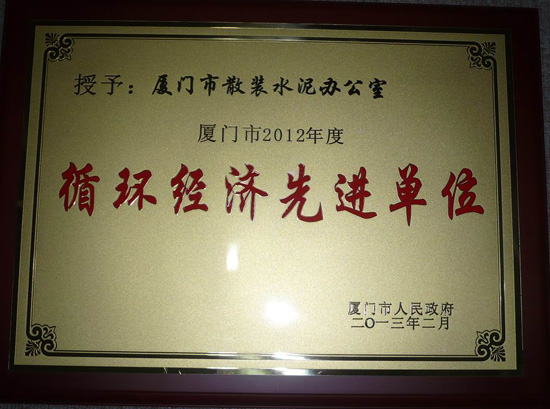 廈門市散裝水泥辦公室在推廣散裝水泥事業的工作取得的顯著成績,對廈門市發展循環經濟起表率作用并做出突出貢獻,榮獲廈門市2012年度循環經濟先進單位。