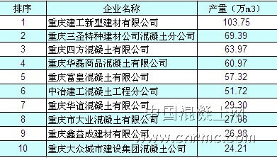 以上前十名企業中,其中三家位于規劃中的兩江新區,建工新材位于渝北區,三圣和富皇位于北碚區(見地圖分布:http://222.73.255.210:8090/map/),建工新材和三圣分別在全市上半年產量排名中分別位于第一和第二名,由此可見建工新材和三圣兩企業已經占據該區域混凝土市場的重要份額。