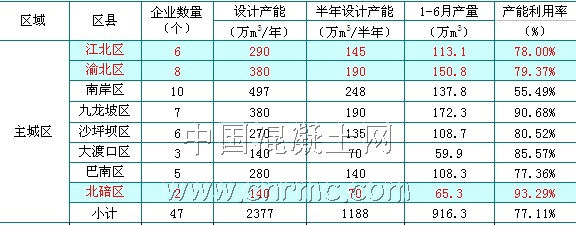 根據重慶市混凝土協會統計(見表2),主城區47家企業上半年設計產能為1188萬方,實際實現產量為916.3萬方,產能利用率為77%;而規劃范圍內兩江新區的16家企業包括江北區6家,渝北區8家,北碚區2家,年設計產能共810萬方(按180m3/時的攪拌機,年設計產能30萬方計算,下同),半年設計產能405萬方,上半年兩江新區的這16家企業預拌混凝土實際產量共計392.2萬方,產能利用率高達81%,如此看來,兩江新區主要混凝土企業產能利用率遠遠高于整個重慶市產能利用率,大大反應了該新區將是未來重慶市混凝土行業快速發展的增長點。