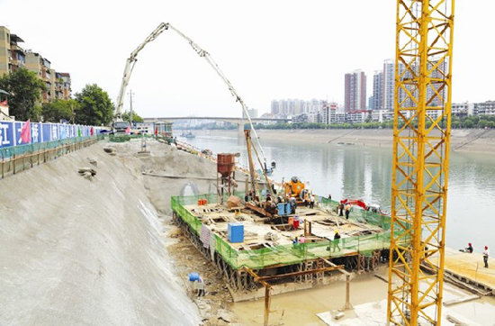 當日上午10時許,記者在施工現(xiàn)場看到,工人分外小心地操作著泵車,把混凝土澆筑入5號樁基內(nèi)。隔江望去,同為大橋施工點的三江橋江北側(cè),一派繁忙景象。整個三江主橋設計為主跨210米的高低塔中央索面混凝土梁斜拉橋結(jié)構(gòu),總長378米,其中西壩主墩采用12根樁長33.5米的大直徑樁基,江北主墩采用10根樁長48米的樁基。