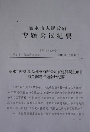 《會議紀要》明確標示:在沒有現行有效的限制進入規定的情況下,本著依法行政的要求,原則同意中凱公司混凝土項目進入麗水,蓮都區政府和市直相關部門要依照法律、法規,參照市區現有同類企業做好審批和服務工作。