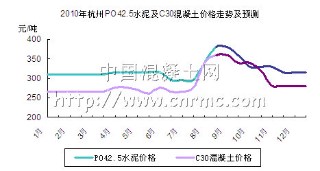 鑒于以上現象中國混凝土網認為,水泥價格的飆升只是短暫的現象,一方面對于原材料水泥來說,并不像混凝土那樣有地域和時間限制。如海南省地區,既然省內水泥比兩廣地區高出170元/噸,不妨比較一下從兩廣進購水泥和從當地購買水泥的運輸費用,企業舍近求遠完全可以抵消漲價帶來的成本,甚至還有剩余。另一方面,水泥行業淘汰落后產能企業后,短時間內水泥價格肯定會有所波動,當部分水泥廠家適當增加一點供應量,價格也將回落到合理的價位。如圖中所預測的那樣,過了8、9月份的市場波動期,第四季度的水泥及混凝土價格將回落至原先平穩狀態。