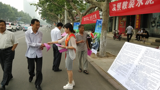 2013年6月15日—6月21日為“2013年全國散裝水泥宣傳周”,為進一步提升散裝水泥、預拌混凝土、預拌砂漿的社會認知度,營造發展散裝水泥的輿論環境,根據《商務部辦公廳關于開展2013年全國散裝水泥宣傳周活動的通知》和山東省經信委《關于開展2013年散裝水泥宣傳周活動的通知》的要求,臨沂市散裝水泥辦公室積極開展散裝水泥宣傳周活動,6月15日在市區沂蒙路設立了宣傳服務站,副市長馬崑同志到現場觀摩指導,市行業協會管理辦公室副主任張亞利同志、市散裝水泥辦公室主任張劍同志帶領工作人員在現場宣傳散裝水泥的相關知識。