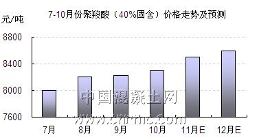 據中國混凝土網監測,7月以來國內羧酸母液始終保持平穩上升態勢,平均環比增長幅度為2.3%(以40%固含、MPEG合成的羧酸為例,下同),雖然漲幅不大,但足以說明聚羧酸減水劑在近期原材料價格普遍上漲的情況下仍然保持良好態勢。本月廠家最新報價基本維持在8500元/噸左右,較7月份8000元/噸的價格上漲了3.75%(見下圖)。預計年底之前價格仍將平穩運行,基本價格將保持在8500元/噸左右。