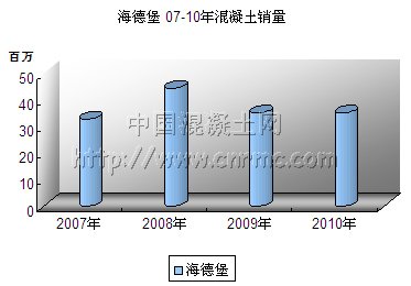 豪西蒙作為一家擁有200年歷史的瑞士企業(yè),其2010年預(yù)拌混凝土的銷售量就已達4590萬m³,下表為本網(wǎng)對公司07-10年混凝土銷量進行的統(tǒng)計。