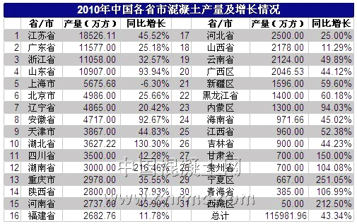據中國混凝土網不完全統計,2010年中國商品混凝土產量達11.6億立方米,比2009年增加35065.61萬立方米,漲幅達到43.34%。其中西北和中南地區增長幅度較大,分別增長66.79%和52.00%,華東和華北地區分別增長42.62%和31.66%,西南地區增長45.38%,東北地區增長幅度最小,但也達到29.38%。對比往年的數據,2010年商品混凝土的增長量有了一個大飛躍。