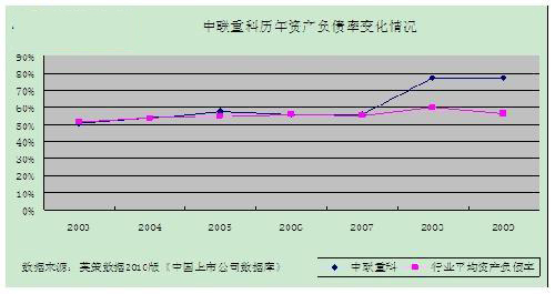 資本結構方面,2007年以前中聯重科的資產負債率一直處于60%以下的健康水平,與行業平均水平相當。08、09年,隨著公司經營規模的不斷擴大,其資產負債率連續兩年接近80%,存在一定償債風險。今年一季度,公司通過定向增發2.98億元,導致一季度資產負債率大幅下降,3月末降到68.13%。公司歷年資產負債率變化情況,如下圖所示: