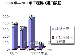 凡事都具有兩面性。形勢(shì)大好之時(shí),就必定有低潮。2008年4季度,混凝土泵與機(jī)動(dòng)混凝土攪拌車(chē)進(jìn)口232.4萬(wàn)美元,同比減少21.7%;2009年1季度進(jìn)口412.2萬(wàn)美元,同比增長(zhǎng)54.7%;2010年1季度進(jìn)口229.5萬(wàn)美元,同比減少44.3%;2011年1季度進(jìn)口143萬(wàn)美元,同比減少37.7%;其中大部分進(jìn)口量出現(xiàn)負(fù)增長(zhǎng),反映我國(guó)內(nèi)需不足。另一方面,進(jìn)口量在的下降的情況下,同時(shí)也在不斷的逐年遞減,使該情況得到了遏制,并逐漸好轉(zhuǎn)。