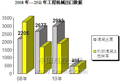 我國(guó)機(jī)動(dòng)混凝土攪拌車(chē)出口量表現(xiàn)良好,在工程機(jī)械中具有領(lǐng)先地位,2008年尤為明顯;其次,由于面臨經(jīng)濟(jì)衰退,我國(guó)實(shí)施了宏觀(guān)調(diào)控政策,國(guó)際經(jīng)濟(jì)受到震蕩,受到經(jīng)融風(fēng)暴的沖擊,2009年的混凝土泵和機(jī)動(dòng)混凝土攪拌車(chē)的進(jìn)出口總數(shù)相比有所回落, 但并不影響我國(guó)工程機(jī)械進(jìn)出口方面的發(fā)展;我國(guó)基礎(chǔ)設(shè)施建設(shè)具有連續(xù)性和長(zhǎng)期性,工程機(jī)械在建筑行業(yè)中具有用武之地;2010年的進(jìn)出口開(kāi)始慢慢回暖,并且呈現(xiàn)快速增長(zhǎng)態(tài)勢(shì),對(duì)其發(fā)展提供了更大更廣闊的空間;截止至2011年1季度,混凝土泵與機(jī)動(dòng)混凝土攪拌車(chē)的表現(xiàn)尚算穩(wěn)定,更加鞏固了我國(guó)工程機(jī)械行業(yè)的國(guó)際地位。