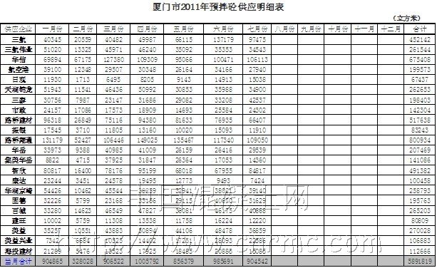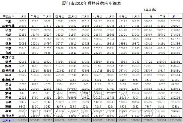 據中國混凝土網統計,截至到2010年廈門擁有混凝土企業23家,擁有63臺攪拌機,泵車120臺,攪拌車數量825輛。由于通貨膨脹的壓力,2010年對于整個福建省經濟體系都是處于戰略調整,據悉,廈門市2010年混凝土產量約為733.69萬方。雖然較上年同期有所下降,但依然處于平穩調整狀態。2010年廈門有年產量突破五十萬方的企業,包括廈門路橋翔通股份有限公司、廈門華信混凝土工程開發有限公司等。