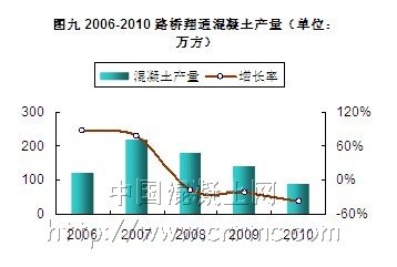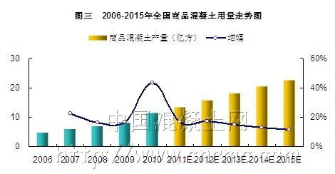 如圖三所示2006至2010年,中國的商品混凝土市場一路飄紅。2010年迎來了頂峰,同比增產更是達到了43.4%。但預計“十二五”期間,由于政策上的宏觀調控,導致房地產市場受壓;另外各地區的城市化建設趨于飽和,導致商品混凝土增速有所放緩。但這并不影響混凝土市場的未來發展趨勢,由于禁現政策等一些列政策的出臺,商品混凝土的市場依然會處于增長。