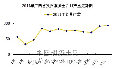 據(jù)廣西省散裝水泥辦公室統(tǒng)計(jì)數(shù)據(jù)得出,2011年,該省全年完成預(yù)拌混凝土2579.15萬方,比去年同比增長(zhǎng)26.03%。其中,南寧市預(yù)拌混凝土產(chǎn)量依舊還是領(lǐng)頭羊的角色,2011年預(yù)拌混凝土產(chǎn)量達(dá)871萬方,但增速有放緩趨勢(shì),與去年同期相比,增長(zhǎng)僅6.14%。除此之外,該區(qū)其他城市的預(yù)拌混凝土產(chǎn)量也有所增長(zhǎng)。