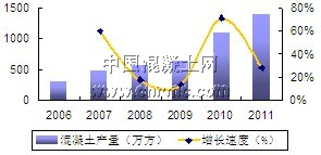 2006—2011年上海城建混凝土產(chǎn)量增長(zhǎng)變化情況  數(shù)據(jù)來(lái)源:中國(guó)混凝土網(wǎng)整理
