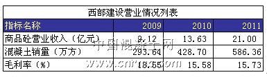 2011年,西部建設(shè)集團(tuán)共計(jì)33個(gè)攪拌站,集中分布在新疆烏昌及巴州等地。公司共生產(chǎn)銷售商品混凝土586.36萬(wàn)立方米,比2010年增長(zhǎng)36.78%;營(yíng)業(yè)收入209965.64萬(wàn)元,比2010年增長(zhǎng)54.08%;商品混凝土毛利率15.73%,同比增長(zhǎng)0.15個(gè)%。“十二五”期間,公司規(guī)劃繼續(xù)以混凝土業(yè)務(wù)為核心,合理延伸產(chǎn)業(yè)鏈,提升產(chǎn)業(yè)整合能力,推進(jìn)全產(chǎn)業(yè)鏈運(yùn)營(yíng)。同時(shí),擇機(jī)進(jìn)入西北市場(chǎng)和內(nèi)地市場(chǎng),成為混凝土行業(yè)的領(lǐng)軍企業(yè)。2012年該公司計(jì)劃完成660萬(wàn)立方商品混凝土,全年實(shí)現(xiàn)利潤(rùn)總額16790.75萬(wàn)元,較上年實(shí)際數(shù)16167.07萬(wàn)元,增加623.68萬(wàn)元。